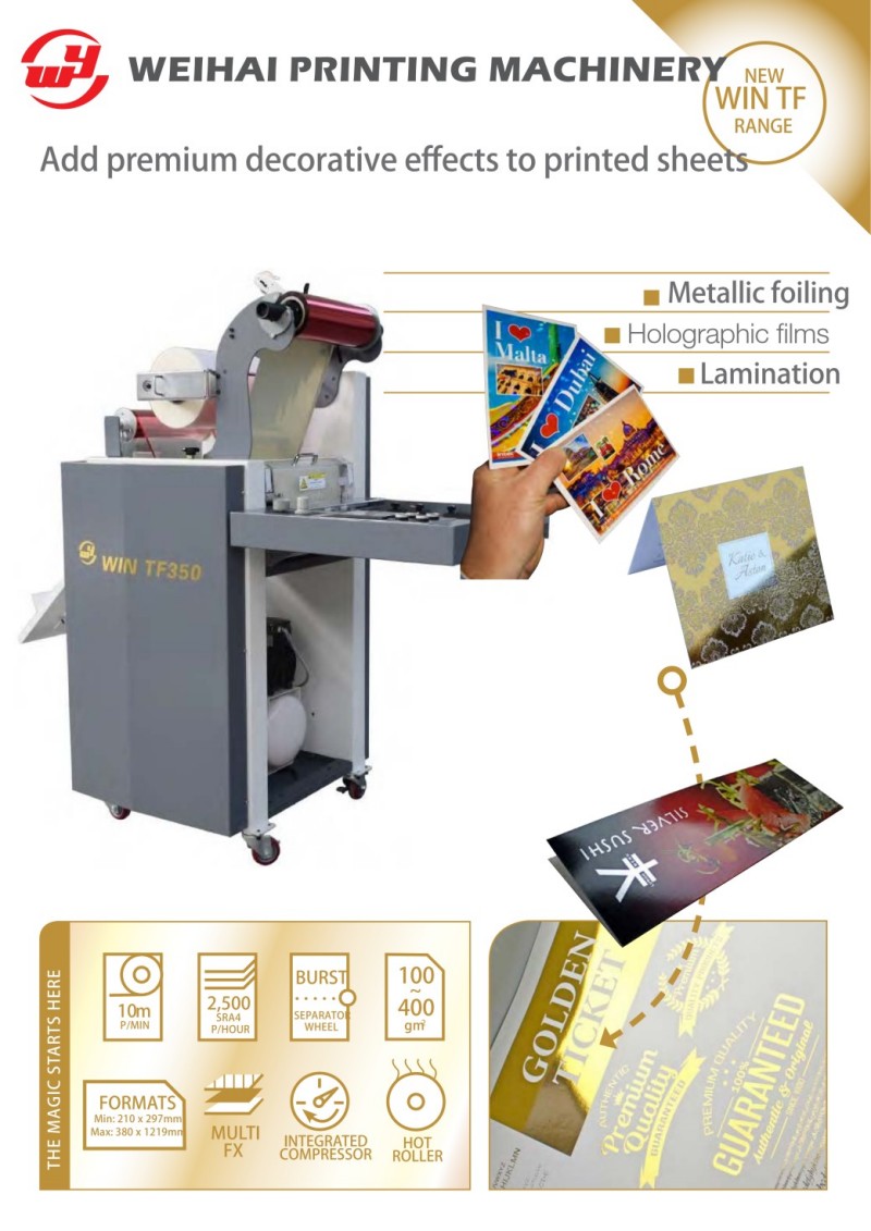 WIN은 디지털 프레스 및 매엽 디지털 잉크젯 프레스와 원활하게 연결되는 제판이 필요 없는 라미네이팅 및 포일링 기계라고도 불리는 전문적인 라미네이팅 및 포일링 기계(TF350/ATF380)를 제공합니다. 이 고효율 포스트프레스 장비는 라미네이팅, 핫 스탬핑 및 콜드 포일링 기능을 통합합니다. 광택 필름, 무광택 필름, 레이저 필름은 물론 정밀한 금속 포일 스탬핑을 한 번에 적용할 수 있습니다. 정확한 온도 및 압력 제어 기능을 갖춘 이 라미네이팅 및 포일링 기계는 거품이 없고 뒤틀림이 없으며 견고한 스탬핑 효과를 보장합니다. 자동 용지 공급, 안정적인 운반 및 고정밀 등록을 지원하여 인쇄물의 외관과 부가가치를 크게 향상시킵니다. 내구성이 뛰어나고 작동하기 쉬운 이 라미네이팅 및 포일링 기계는 고급 명함, 선물 상자, 인증서, 책 표지 및 고급 홍보 자료에 널리 사용됩니다.
